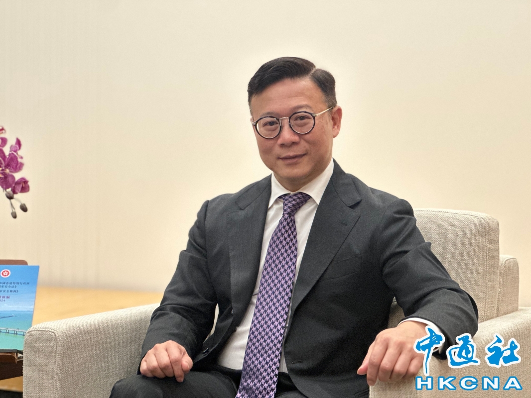 香港律政司副司长张国钧接受中通社专访。(记者 陈卓仪摄)