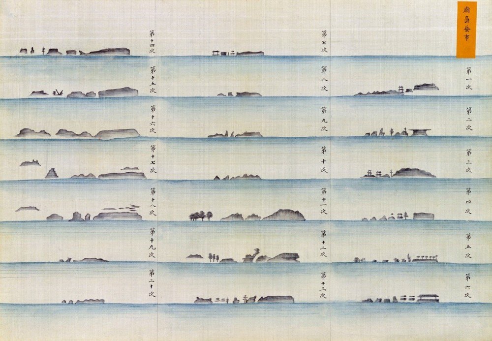 《渤海阅师图》之〈庙岛蜃市〉:光绪十二年(1886年)四月,醇亲王奉慈禧太后(1835–1908年)懿旨巡阅北洋水陆各军,是清王朝最高规格的海上军事校阅。十八日下午二时,醇亲王从旅顺出发,前往威海卫,船行四十余里至庙岛时,看见海市蜃楼奇观,命令随员庆宽(1848–1927年)等照绘,〈庙岛蜃市〉即为此图。根据随行官员周馥(1837–1921年)所编《醇亲王巡阅北洋海防日记》,此次难得一见的海市蜃楼景象据描述为“楼台隐见,林树扶疏,树外若有数僧翘首立迎”。